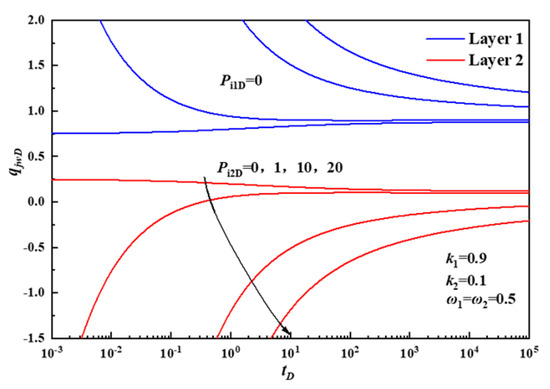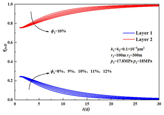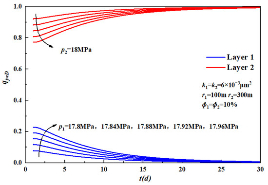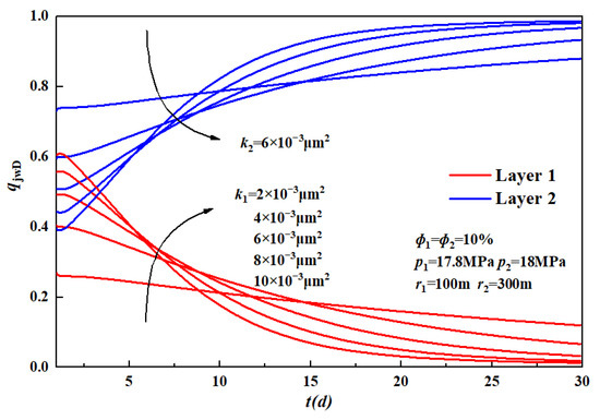 Taking a two-layer combined reservoir as an example, the permeability of each layer is maintained at a constant level to investigate the influence of the storage coefficient on layer flow behavior. Figure 2 illustrates the relationship between layer flow and the storage coefficient under different permeability conditions with equal initial pressure. When both layers have equal permeability, the layer with a higher storage coefficient exhibits a greater contribution to flow. Conversely, when the permeability of the two layers is unequal, the layer with a higher permeability and storage coefficient has a higher flow contribution. Additionally, in cases where there is a high permeability but low storage coefficient, there exists an intersection point in the early stage of production on the flow contribution curve for that particular layer; however, during later stages of production, it is observed that layers with a high permeability exhibit higher flow contributions.