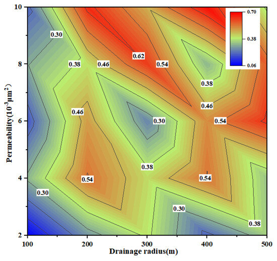 The isoline map presented in Figure 12 illustrates the contribution ratio of the two primary factors, namely the drainage radius and permeability, to the gas reservoir production. In this representation, the blue region is the area with a low contribution ratio, and the red area is the area with a high contribution ratio. As depicted in the figure, an increase in both drainage radius and permeability leads to a corresponding elevation in the production contribution ratio for this particular layer.