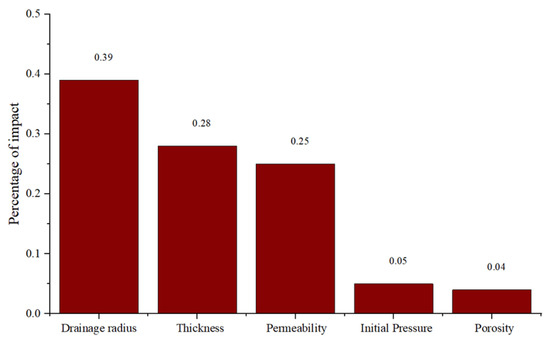 Table 9 shows the results of analysis of variance, where the F value represents the level of significance and the p value indicates the magnitude of difference. The findings reveal that the maximum F value of the drainage radius is 3.89, and the significance degree accounts for 38.71%, as shown in Figure 13. It was followed by thickness and permeability, whose F-values were 2.84 and 2.48, respectively, and the significant degree accounted for 28.26% and 24.68%. However, porosity and initial pressure do not exert significant influence on yield contribution. The order of importance for significant effects is as follows: drainage radius > thickness > permeability > initial pressure > porosity, and the three most important factors were drainage radius, permeability, and thickness, which was consistent with the results of range analysis.