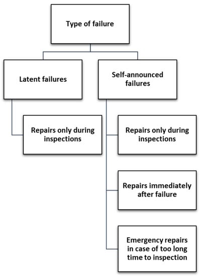 De Jonge et al. [] consider perfect repairs and assume that both corrective and preventive maintenance make the system “as good as new”. The authors model a system deterioration process using a homogeneous gamma process. Van der Weide and Pandey [] present an analytical model for evaluating the maintenance cost of engineering systems, including periodic inspections and condition-based preventive maintenance. They evaluate the cost rate as a function of inspection cost, maintenance, and unavailability. The authors highlight differences in the approach to maintenance cost evaluation for systems characterized by latent failures and self-announced failures. In the reliability analysis of renewable systems, when modelling their maintenance and estimating maintenance costs, the characteristics of system failures and information about them are of key importance. That is, whether failures are automatically detected (so-called self-announced failures, allowing the immediate reparation of the system) or the information about failures is hidden. In the latter case, a failure is not immediately visible (so-called latent failures), and therefore the failures can only be detected and repaired during a system’s inspections. Such classification of failure type in terms of maintenance and repair planning for a system is illustrated in Figure 1.