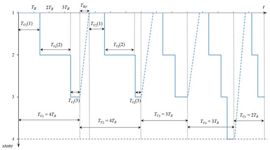 Note that depending on the repair objectives, some values of variables representing the time of the system being in reliability states can equal zero. For example, if the system is repaired to State 2 and the next repair is undertaken in State 3, then, during this cycle, Inequality always holds, where fin is the final reliability state of a system in a given cycle.