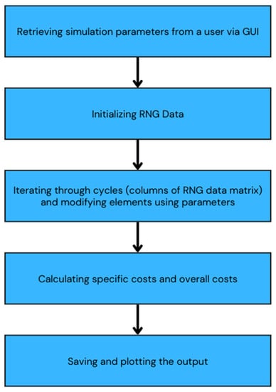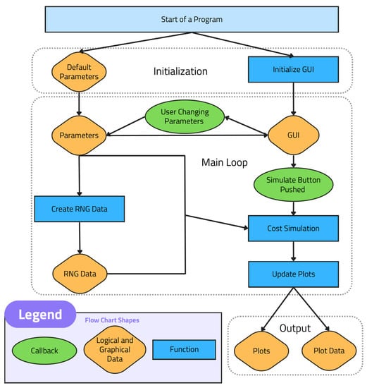 Upon the launch of the application, a GUI is initialized and default parameters are loaded. The Cost Simulation function is then executed using these parameters, and initial plots are drawn. From this point on, the user can change the parameters in the GUI and execute the simulation by clicking the “Simulate” button. The plots are automatically drawn after the calculations are completed. The flowchart of cost simulation, illustrating the application’s operation and individual stages of data processing, is presented in Figure 4.