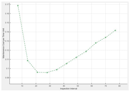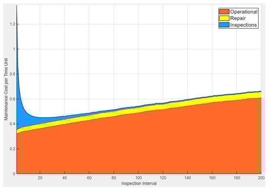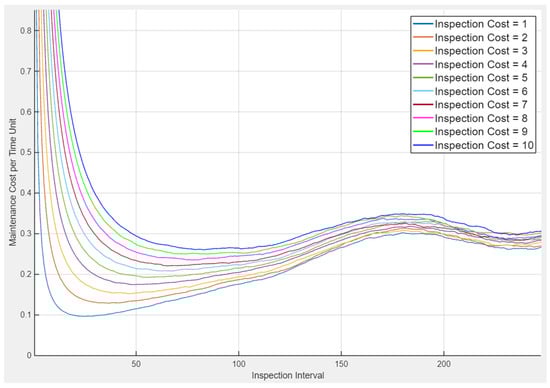 - Inspection Cost—a fixed cost of each inspection performed, regardless of whether it results in performing a repair or not; inspections occur periodically and are called off only when they happen during an ongoing repair. We assume that an inspection either does not require the shutdown of the system or that the time of such shutdown is negligible and, in that case, the cost of the shutdown should be included as a part of the Inspection Cost parameter. For the case study, we assume it equals one unit of cost.