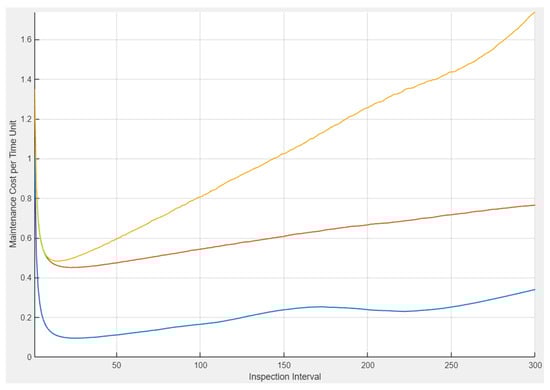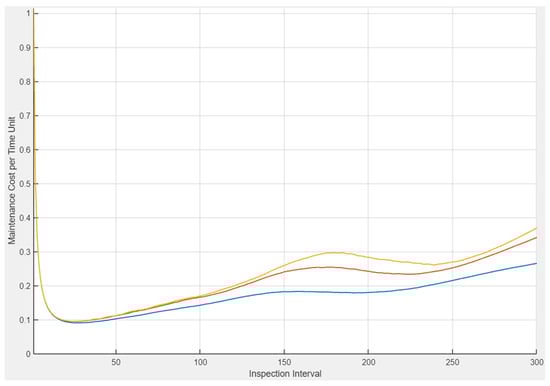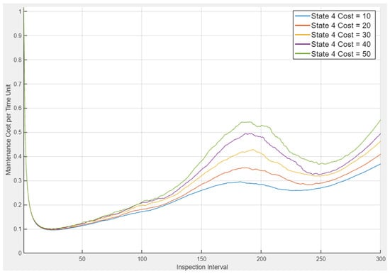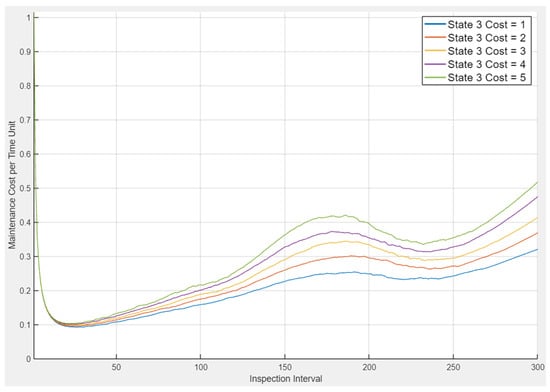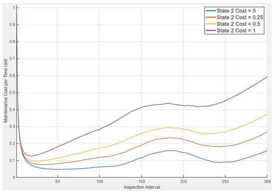 Figure 12 depicts the impact of various operational costs related to the state of restricted ability on the total maintenance cost. When the cost of State 2 is equal to zero, we can consider entering this state as the activation of an early warning system with no influence on the overall system output. It is evident that as the costs generated by State 2 increase, maintenance cost increases and the optimal inspection interval decreases rapidly.