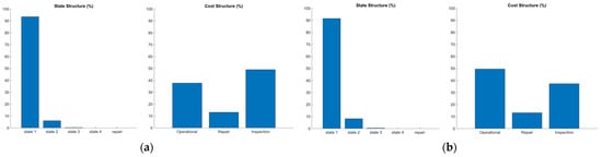 Figure 5 and Figure 6 show operation and maintenance cost of the system under a maintenance policy in line with the assumptions provided in Section 3.2.1. Figure 5 refers to the case of conducting repairs if the system, at the moment of inspection, is in State 2 (restricted ability) or worse. This strategy is hereinafter referred to as the “always repair” policy. Figure 6 presents results in the case of conducting repairs if the system is in State 3 or State 4, and we hereafter refer to this policy as “repair from State 3”. In both cases, we assume the possibility of conducting repairs between scheduled inspections at extra cost (referred as “emergency repair”) in the case that the system stops operating.