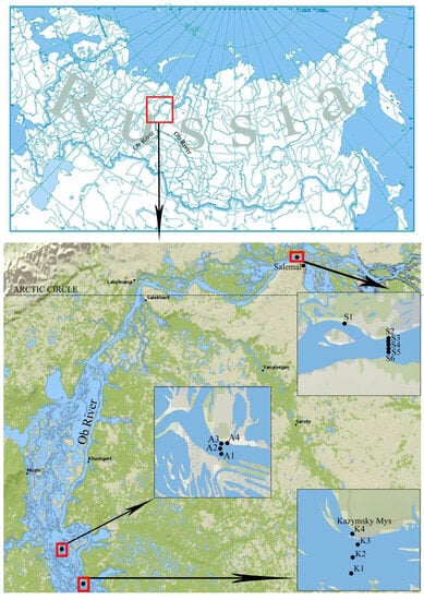 The Azovy transect (St. A) goes over the Little Ob river. The bottom of the left bank is covered with sand and organic silt; that of the right bank consists of solid sandy deposits. The Kazym-Mys transect (St. K) is located against Kazym-Mys village. The bottom of the right bank is formed by boulders and coarse pebbles intermitting with sand and organic silt in bays; that of the left bank is covered with solid coarse sandy deposits. The Salemal transect (St. C) is situated at the Ob river 8 km upstream from the Salemal village at the narrowing of the riverbed. The bottom of the right bank is covered with medium-sized and coarse pebbles and boulders; that of the left bank is formed by solid silt–clayey deposits with detritus.
