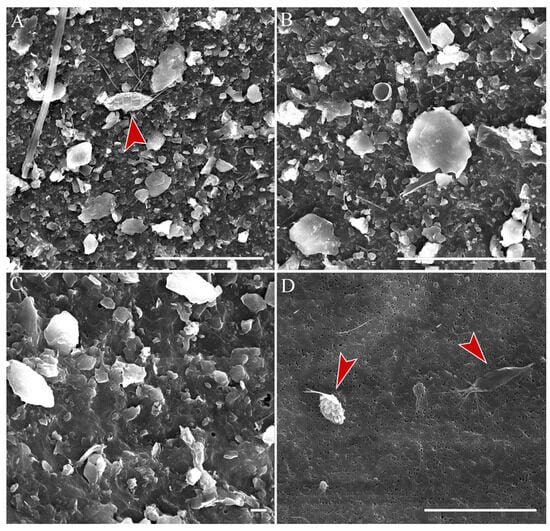 Micrographs of water samples from stations with high and low turbidity. SEM: (A) view of a part of the filter from St. S6 with numerous particles of clay and a cell of Mallomonas punctifera (red arrow); (B) a large particle of clay at high magnification (St. K2); (C) small particle of clay at high magnification (St. K2); (D) view of a part of the filter from St. K4 with low turbidity. Individual cells of Mallomonas akrokomos and M. crassisquama (red arrows) are seen on the filter. Scale bars: (C) 2 µm; (A,B,D) 50 µm.