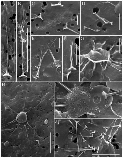 Spiniferomonas taxa from the Ob river, SEM: (A) Spiniferomonas bourrellyi, long spine; (B,C) S. silverensis, long spine (B), spines and plate scales (C); (D) S. takahashii, spines and plate scales; (E) S. trioralis, spines and plate scales; (F,G) Spiniferomonas sp., spines and plate scales; (H) S. triangularis, a cell covered with long spine and plate scales; (I) S. serrata, spines and plate scales; (J) S. abrupta, spines and plate scales. Scale bars: (C–G) 2 µm; (I,J) 5µm; (A,B,H) 10 µm.
