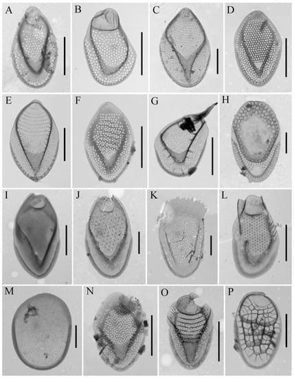 Mallomonas taxa from the Ob river, TEM: (A) Mallomonas kuzminii; (B) M. alpina; (C) M. elongata; (D) M. tonsurata; (E) M. costata; (F) M. trummensis; (G) M. acaroides, caudal scale; (H) M. insignis; (I) M. kalinae; (J) M. calceolus; (K) M. punctifera; (L) M. papillosa; (M) M. caudata; (N) M. actinoloma; (O) M. actinoloma var. maramuresensis; (P) M. heterospina. Scale bars: 2 µm.