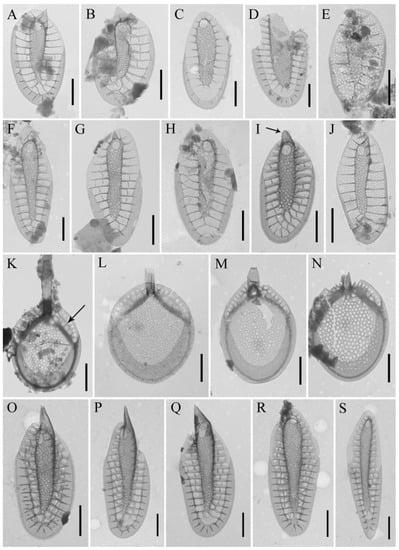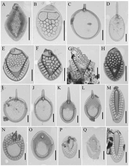 - Siver, P.A.; Wolfe, A.P. Eocene scaled chrysophytes with pronounced modern affinities. Int. J. Plant Sci. 2005, 166, 533–536. [Google Scholar] [CrossRef]