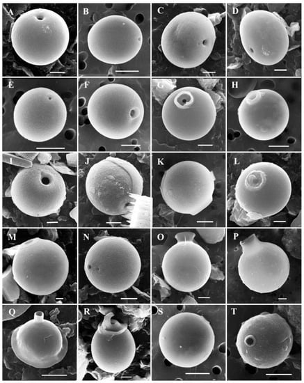 Stomatocysts from the Ob river, SEM: (A) Stomatocyst 001 Duff and Smol, 1988; (B) Stomatocyst 29 Duff and Smol, 1989; (C) Stomatocyst 41 Piątek, 2007; (D) Stomatocyst 49 Duff and Smol, 1991; (E) Stomatocyst 188 Brown and Smol, 1994; (F) Stomatocyst 58 Duff and Smol, 1994; (G) Stomatocyst 183 Brown and Smol, 1994; (H) Stomatocyst 234 Duff et al., 1995; (I) Stomatocyst 152 Zeeb and Smol, 1993; (J) Stomatocyst 181 Brown and Smol, 1994; (K) Stomatocyst 112 Zeeb et al., 1990; (L) Stomatocyst 198 Duff and Smol, 1994; (M) Stomatocyst 203 Duff and Smol, 1994; (N) Stomatocyst 462 Firsova and Bessudova, 2018; (O) Stomatocyst 10 Duff and Smol, 1988; (P) Stomatocyst 279 Gilbert and Smol, 1997; (Q) Stomatocyst 380 Wilkinson and Smol; (R) Stomatocyst 135 Duff and Smol, 1992; (S) Stomatocyst 262 Zeeb and Smol, 1996; (T) Stomatocyst 263 Zeeb and Smol, 1996. Scale bars: 2 µm.