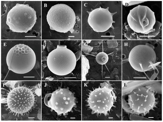 Some spines of the S. bourrellyi found in the study area had pores (Figure 3L). We had observed such morphological features in spines in Lake Labynkyr (Figure 2I in []). Pores on spines are not typical of species of the genus Spiniferomonas [,], most often they characterize representatives of Chrysosphaerella []. Nonetheless, the found specimens cannot be referred to as the genus Chrysosphaerella as they have lamellar scales of simple structure, with one lacuna. Furthermore, a septum is typical of Chrysosphaerella spines [] but was absent from the specimens found. The cells may belong to a new species, though only molecular studies can resolve the issue.