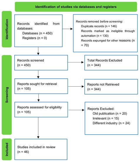 As shown in Figure 1, the author also used the Preferred Reporting Items for Systematic Reviews and Meta-Analyses (PRISMA) approach to synthesize and select the most appropriate studies [70]. The PRISMA checklist document is provided in the Supplementary Materials (See Table S1). The research on the selected databases returned more than 450 studies. However, not all of them met the eligibility criteria, as some fell below the required year of publication. A total of 60 articles were published between 1995 and 1999, falling below the 2000 and 2023 range. Although the old publications have important elements, it was not considered appropriate to include them due to the analysis carried out with PRISMA. More than 286 articles were rejected for various reasons, including being duplicates or irrelevant to the research topic. This left a total of 105 articles to be used in the research, including an additional reference on the PRISMA method presented in Table S1 from the supplementary material. Out of this number, a total of 46 articles met the required inclusion criteria for analysis, while the remaining 59 articles were included in the references.