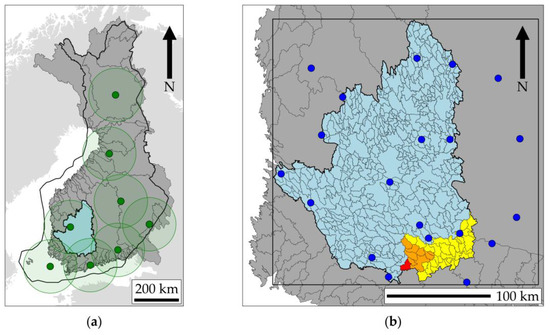 (a) Location of the Kokemäenjoki river basin (light blue area) and the radar network (green circles with a 120 km radius); (b) 3rd-delineation-level subbasins within the study area (light blue), as well as selected 1st (yellow)-, 2nd (orange)-, and 3rd (red)-level subbasins. Rainfall gauge network (dark blue circles) is also shown.