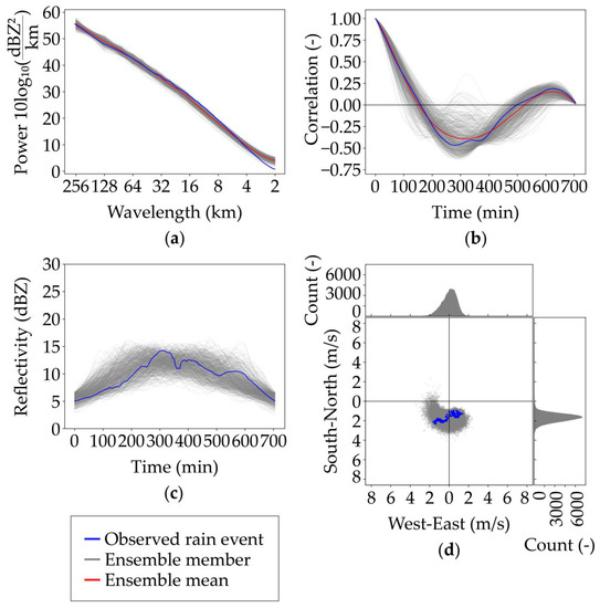 Performance of the rainfall simulation model was evaluated for events 1 (Figure 3) and 2 (Figure 4) by comparing ensemble mean radially averaged spatial power spectra (Figure 3a and Figure 4a), mean areal rainfall (Figure 3b,c and Figure 4b,c), and advection velocities (Figure 3d and Figure 4d) between the observed and simulated rain fields.