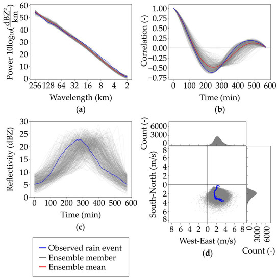 Model performance for event 2. (a) Ensemble average radially averaged 1D spatial power spectra; (b) temporal autocorrelation functions of the mean areal rainfall; (c) mean areal rainfall broken line time series; (d) advection velocities to southern and eastern directions with marginal plots presenting ensemble distribution. Observed event is illustrated with blue, simulated ensemble members with gray, and ensemble average with red color.