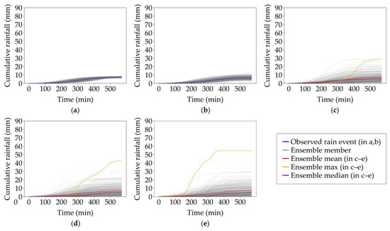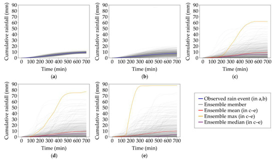 Event 1 cumulative areal rainfall (mm) time series for (a) the entire radar field, (b) the entire Kokemäenjoki river basin, (c) the selected 1st-delineation-level subbasin, (d) the selected 2nd-delineation-level subbasin, and (e) the selected 3rd-delineation-level subbasin. Observed event is illustrated with blue (a,b), simulated ensemble members with gray (a–e), realization with ensemble mean cumulative areal rainfall with red (c–e), realization with ensemble maximum cumulative areal rainfall with orange (c–e), and realization with ensemble median cumulative areal rainfall with yellow color (c–e).