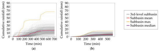 Cumulative areal rainfall (mm) time series of each 3rd-delineation-level subbasin for (a) event 1 and (b) event 2. 3rd-level subbasins are illustrated with gray, subbasin mean cumulative areal rainfall with red, subbasin with maximum cumulative areal rainfall with orange, and subbasin with median cumulative areal rainfall with yellow color.
