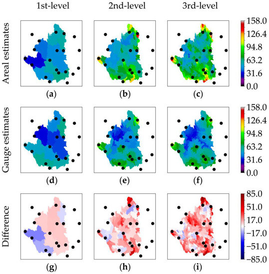 Event 2 ensemble maximum of total event rainfall (mm) utilizing areal estimates for (a) 1st-level subbasins, (b) 2nd-level subbasins, and (c) 3rd-level subbasin. Ensemble maximum of total event rainfall (mm) utilizing gauge estimates for (d) 1st-level subbasins, (e) 2nd-level subbasins, and (f) 3rd-level subbasin. The difference (mm) between two calculation methods (areal–gauge) for (g) 1st-level subbasins, (h) 2nd-level subbasins, and (i) 3rd-level subbasin. Gauge locations are denoted with black circles.