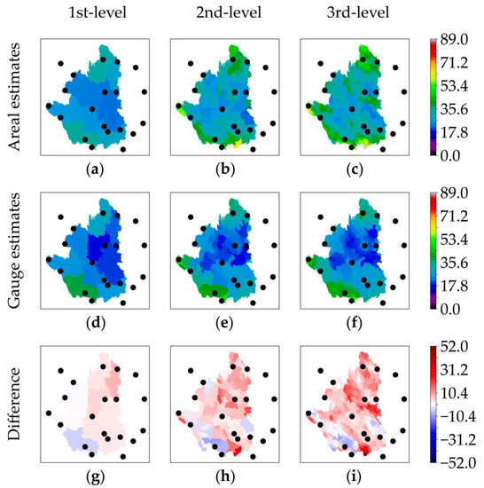 Event 1 ensemble maximum of total event rainfall (mm) utilizing areal estimates for (a) 1st-level subbasins, (b) 2nd-level subbasins, and (c) 3rd-level subbasin. Ensemble maximum of total event rainfall (mm) utilizing gauge estimates for (d) 1st-level subbasins, (e) 2nd-level subbasins, and (f) 3rd-level subbasin. The difference (mm) between two calculation methods (areal–gauge) for (g) 1st-level subbasins, (h) 2nd-level subbasins, and (i) 3rd-level subbasin. Gauge locations are denoted with black circles.