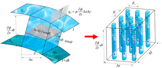 During the discharge process, the relationship between the net flow through the surface areas and the rate of change of water amount in the control volume can be given by the following continuity equation [10,11]: