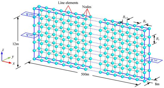 The orthogonal line element mesh. The dimensions of this aquifer are 500 m in length, 12 m in height and 8 m in width. Different from the solid element (tetrahedron and hexahedron), for which that the flow domain is mapped using the nodes and lines.