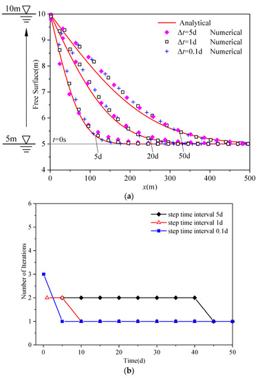 Figure 4a presents the evolution of free surface locations over time from the proposed line element method, and good agreements with the analytical solutions can be commonly obtained for different mesh sizes. The variation of iteration steps over time plotted in Figure 4b shows that the numerical solutions in each timestep can be obtained with less than three iteration steps, which indicates that the convergence of the proposed line element method is fast for different mesh sizes.