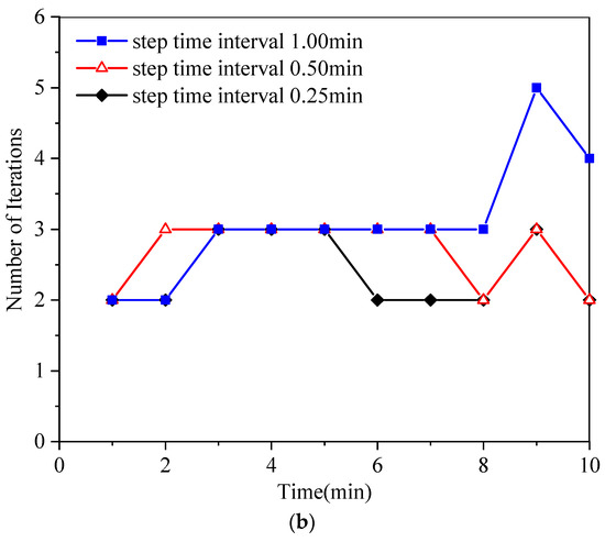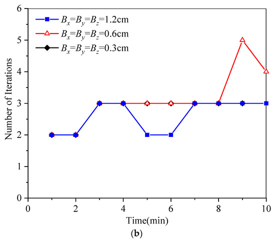 Figure 5a,b shows the evolutions of free surface locations and iteration steps over time for different time steps, respectively. The mesh size is fixed as Bx = By = Bz = 1 m. The numerical results are almost consistent with the theoretical solutions and converge within three steps, which demonstrates that the proposed method is robust for different time steps.