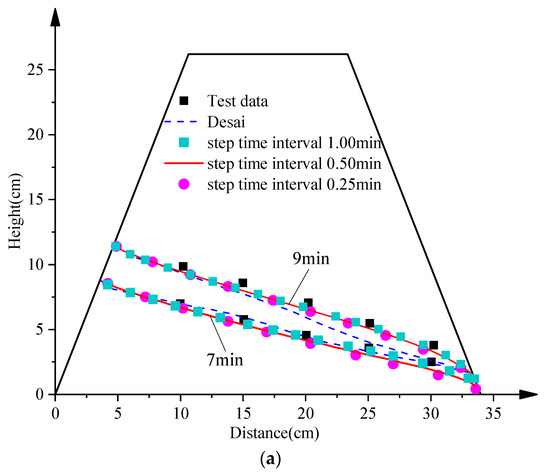 Similar to the first example, the effect of mesh size and time step are shown in Figure 7 and Figure 8. For different mesh sizes, the time step is fixed as 1 min. For different time step, the mesh size is set as 0.6 cm. The model results after 7 min and 9 min agree well with the experimental data conducted by Desai et al. [10] and the computational efficiency can be well guaranteed. For comparison, the simulated data attained from Desai et al. [10] are also given, and the deviation of free surface location at 9 min is much larger than the proposed line element method.