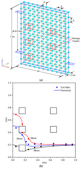 The laboratory experiment through an isotropic sand flume reported by Hu et al. [31] is illustrated in Figure 9a, which contains five rectangular drainage tunnels. The hydraulic parameters of the fine sand soil are given as kx = ky = kz = 2.4 × 10−3 cm/s and μ = 0.05. The water level at the left boundary gradually decreases from 1.0 m to 0.2 m after 48 min, while the right water level remains at 0.2 m. During numerical analysis, the drainage tunnel is specified as a Signorini-type seepage boundary. The comparisons of free surface locations after 18 min, 30 min and 48 min between the proposed line element and observations from Hu et al. [31] are presented in Figure 9b. The calculated free surface locations are very close to the measurements and are generally achieved within 6 iteration steps.