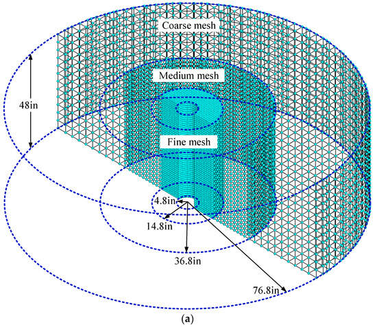 Different from the previous examples with 2D condition, a 3D cylindrical well model, as shown in Figure 10a, is selected to assess the proposed method and investigate the transient free surface flow behaviors in the anisotropic porous media. The hydraulic parameters of the isotropic sand are given as kx = ky = kz = 9.57 inch/min and μ = 0.3. The water level in the well decreases gradually from 48 inch to 12 inch at the initial time, while the water level of the peripheral boundary of the tank remains at 48 inch. Different from the uniform-sized element mesh in the above examples, the well model is divided into three domains meshed with non-uniformed sizes (coarse mesh 4 m, medium mesh 2 m and fine mesh 1 m) as shown in Figure 10a, in which the well with dense mesh is specified as a Signorini-type seepage boundary.