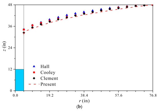 Figure 10b shows the steady free surface location after 30 min. For comparison, the experimental data from Hall [32], numerical predictions from Cooley [33] and Clement et al. [34] are also plotted. The predicted free surface is very close to the measured and other numerical results.