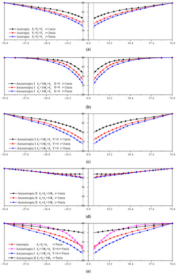 In Figure 11d, the evolution of free surfaces are not evident with time, except for the seepage points near the well. The elevations of the free surfaces are much higher than those of the isotropic case, which is in accord with the observations by Wei et al. [24]. This is because the decrease in kz leads to the increase in flow resistance in the z direction, while the seepage flow predominantly occurs in the horizontal plane, and the hydraulic gradient becomes mild. Similar to the isotropic case, the depression cone in the anisotropic II case is also circular because of the permeability symmetry kx = ky but with smaller curvature. Note that this special effect cannot be characterized by the two-dimensional seepage analysis [37].