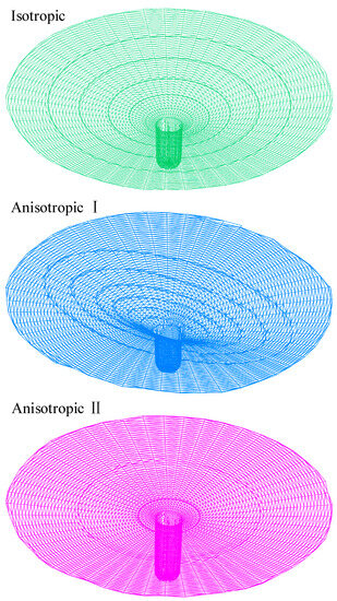 Besides the above isotropic case, two anisotropic cases are additionally applied to illustrate the influence of hydraulic anisotropy on the free surface variation [35,36]. The anisotropic I and II cases are specified as kx = 10ky = kz = 9.57 in/min and kx = ky = 10kz = 9.57 in/min, respectively. The comparisons of free surface variation with time from the isotropic and anisotropic I and II cases are shown in Figure 11. The corresponding 3D depression cones of the three cases after 5 min are presented in Figure 12.