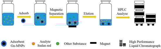 Wu Yalin et al. synthesized and characterized a new type of MNP, polyamide amine dendrimer-modified magnetic nanoparticles (Gn-MNPs) []. As shown in Figure 1, under the adsorption action of the adsorbent Gn-MNP, the Sudan red in the solution was adsorbed by stirring for 1 h. The adsorbent is separated from the original solution by magnetic separation of the magnet. Sudan red is then desorbed from the adsorbent with acetone. After the eluent is dried with nitrogen, the residue is eluted with methanol and dispersed. The dispersed samples are taken and sent for inspection. The nanomaterial has good adsorption performance for Sudan red, methyl green, and Congo red dye in natural water. The detection limit of Congo red is in the range of 1.8~5.5 ng·L−1, and the precision is less than 3.0%. The nanomaterial has significant application potential in the enrichment of trace environmental pollutants in water samples.