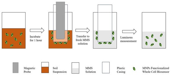 Jia Jianli et al. developed a whole-cell bioreporter ADPWH recA, which combines magnetic nanoparticles with genetically modified Escherichia coli and can judge soil ecotoxicity by luminescence intensity. The application of magnetic nanoparticles allows permanent magnets to recover sensors from soil samples to reduce soil particle interference []. Figure 2 shows the use process of the sensor. After the sensor reacts in the soil diluent, the magnetic probe is used to separate the sensor from the solution, and the luminescence intensity is measured after the MMS solution to characterize the soil eco-toxicity. Compared with the traditional treatment of applying a bioreporter directly to a soil-water mixture (SW-M treatment) or supernatant (SW-S treatment), the bioreporter functionalized with MNPs by a magnetic device (MFB) has higher sensitivity and better reproducibility to evaluate the toxicity and bioavailability of Cr contamination in soil. Zhang et al. used MNPs to combine with Bright Luminescent Bacillus to synthesize a magnetic nanobacterial sensor for detecting soil biological toxicity []. The characteristic of this sensor is that it does not require changing the physical and chemical properties of pollutants in the soil, thus obtaining more accurate results for determining the biological toxicity of contaminated soil [].