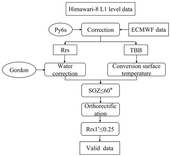 For H8′s L1-level data, we initially conducted atmospheric correction using the refined 6S model. Following correction, we applied the Gordon model to perform water body correction on the remote sensing data. The corrected radiance temperature data were subsequently converted to surface temperature. Using Equations (2) and (3), the atmospherically corrected radiance temperature data were transformed into brightness temperature data. Equation (4) was employed to calculate the surface temperature data. Subsequently, the portion of corresponding to SOZ of less than 60° was considered to be valid data. Equation (5) was applied to correct the for bands 1 to 6, and ultimately, data with ≤ 0.25 were deemed valid. The specific flowchart is illustrated in Figure 1.