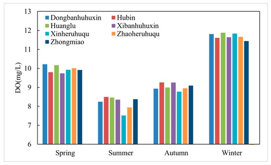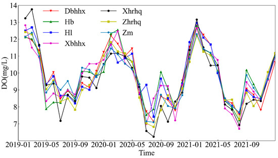 Figure 3 shows the monthly average time series trend of DO concentration at different monitoring sections from 2019 to 2021, and Figure 4 shows the seasonal average of DO concentration over the three years.