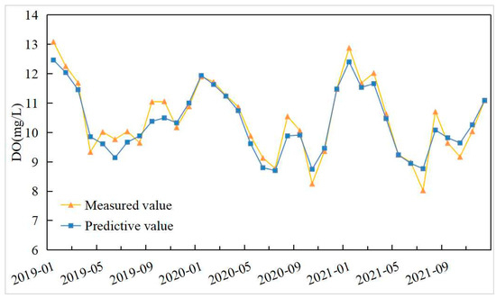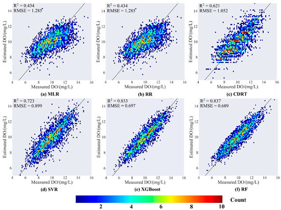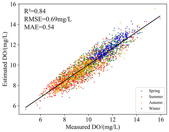 To further validate the performance of RF, we compared the measured DO and estimated DO for each season. As shown in Figure 6, the model performed poorly in the spring season, and DO values in the range of 7–13 mg/L were observed. The spring season was characterized by significant temperature changes, which in turn affected the release rate of oxygen in the lake. The DO concentration varied accordingly. Spring is also a season with relatively high rainfall in the Jianghuai region of China, leading to a large influx of rainwater and runoff into Lake Chaohu. This increases the flow rate of the lake water, and it is also the traditional production season for aquaculture in Lake Chaohu, resulting in a higher discharge of aquaculture waste and a larger range of DO concentration variations.