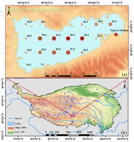 Nam Co is located in the central Tibetan Plateau (90°16′–91°03′ E, 30°30′–30°55′ N) with an elevation of 4718 m (Figure 1). This lake is a closed inland lake, and it gains water from precipitation and melting glacier and loses water mainly through evaporation and ground water [,]. The bathymetry of Nam Co is shown in Figure 1, where the maximum depth is about 95 m and the mean depth is about 40 m [,]. The high elevation generates the low air density and pressure, with the annual average values near the lake surface being 0.73 kg/m3 and 571.2 hPa, respectively (Nam Co station) [,]. The highest monthly temperature in the lake area is about 10 °C, the lowest one is around −12 °C [], the annual precipitation is about 297–550 mm, and the long-term mean annual evaporation is about 832 mm [,,]. Nam Co is barely affected by human activities, making it an ideal location for studying natural lake processes. Nam Co is a typical Tibetan Plateau lake, which has been focused in many studies [,,,,].