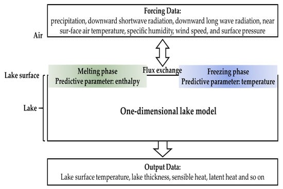 For this study, we used a one-dimensional lake model developed by Ren et al. (2014) to simulate ice processes in Nam Co []. This model is based on the energy balance equation using lake temperature as the prognostic variable during the non-freezing phase. But in the freezing phase, enthalpy is employed as the prognostic variable to filter out the effects of water phase change (Figure 2) []. The lake model simulates the heat and mass exchange processes between the atmosphere and lake surface. The water mixing is described with an eddy diffusion scheme adopted from Henderson-Sellers []. RLake is a layered model, and the layer number and thickness of each layer can be flexibly defined by the user. For this study, we set the total layer number to 56–60 depending on the lake depth in Nam Co. We placed a particular emphasis on the upper strata of the lake: the top 30 layers were precisely set at a thickness of 0.01 m each. This decision was made to capture and reflect the diurnal variations and the subtle fluctuations in lake variables that occur daily. Following the setting of these 30 layers, we gradually and arbitrarily increased the thickness of each successive layer until it culminated at the lake’s bottom. The thickness of the layers near the lake’s bottom varied widely, ranging from a minimum of 4 m to a maximum of 28 m, once again depending on the particular depth of the Nam Co at different regions.