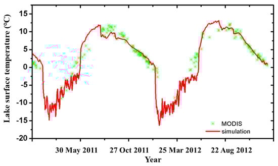 The lake surface temperature serves as a valuable indicator for evaluating lake models as it reflects the lake processes and lake–atmosphere exchange. Assessing the accuracy of lake models heavily relies on this factor. We compared the simulated lake surface temperature for Nam Co over a ten-year span from 2011 to 2012 with MODIS data. The simulation was performed at the central location of Nam Co, which represents the deepest point of the entire lake with a depth exceeding 90 m (30.75° N, 90.75° E). Superior results at this location demonstrate the strong modeling capability of the simulation. Figure 3 demonstrates a satisfactory agreement between the simulated lake surface temperatures and the MODIS data, displaying a correlation coefficient of 0.89 and an average error of 1.75 °C. This alignment suggests that our improved RLake model not only effectively captures the lake–atmosphere exchange but also replicates real lake processes. Therefore, this positions the RLake model as a reliable tool for further simulations regarding lake ice.