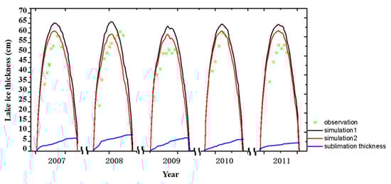 The improved RLake model was utilized to simulate ice thickness (represented by the black line in Figure 4), and a comparison was conducted with the observed ice thickness curve by Qu et al. (2012) at Nam Co from 2006 to 2011 []. The simulation was performed at the closest point to the observation location, located at coordinates 30.85 °N, 90.95° E. Based on the lake depth data provided in Figure 1, we set the lake depth at this coordinate to 36.3 m. Figure 3 illustrates the comparison results, showing that the simulated ice thickness generally exceeds the observed value. This disparity is attributed to the significant impact of sublimation loss on lake ice thickness []. Consequently, the RLake model was enhanced by incorporating the ice sublimation process (Section 2.3.2).