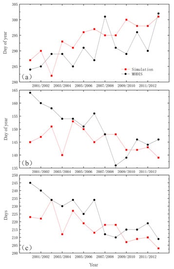 Time series of ice-on (a), ice-free (b), and total ice duration (c) in Nam Co from 2000 to 2013 are presented using both simulated (red line) and MODIS data (black line).