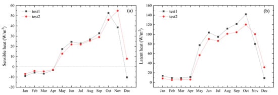 Comparison of simulation results of Test 1 and Test 2; (a) simulate sensible heat; (b) simulated latent heat.