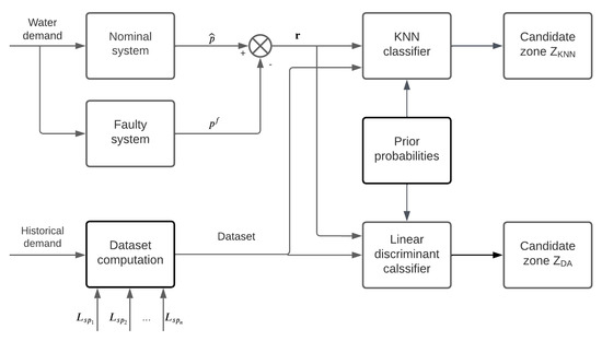 - The training of the DA classifier is an offline process where a set of residual samples corresponding to all possible leakage scenarios are assigned to the corresponding class by means of (21), this stage being when the discriminant functions are generated. In the same way, the dataset to train this classifier is obtained by simulating the leakage scenarios according to the procedure described in Section 2.2.1.