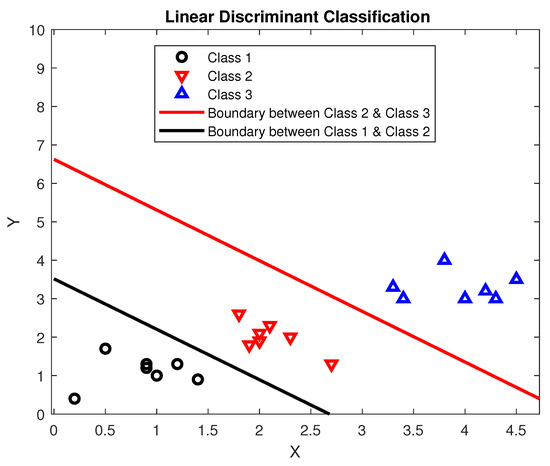 Figure 2 presents an illustrative example of linear discriminant analysis classification involving three different classes. The figure displays the two discriminant functions that allow for the differentiation between the classes.