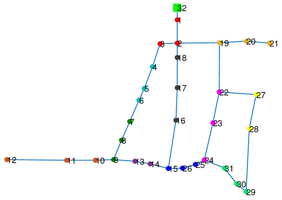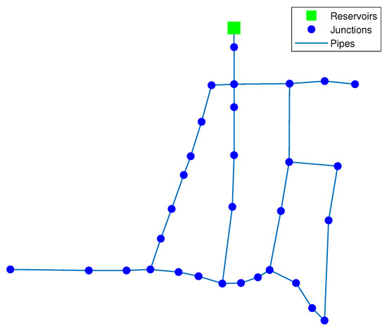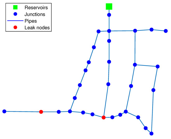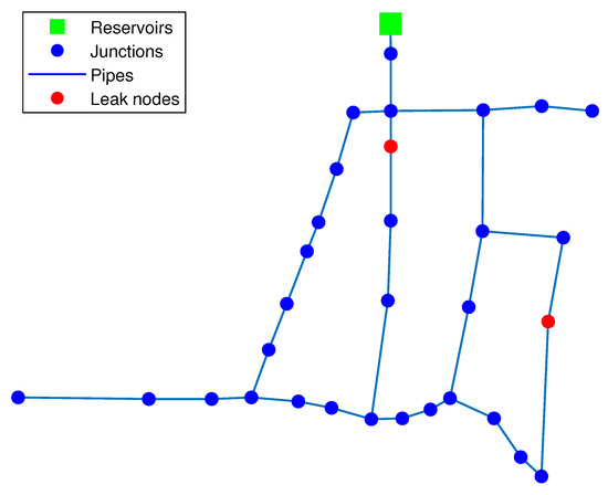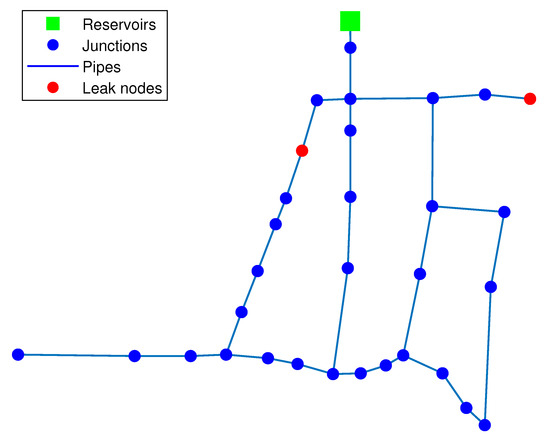 To evaluate the performance of the proposed multi-leak isolation strategy, Hanoi’s WDN is considered since it is a widely used benchmark. This network is built with thirty-one junction nodes, one reservoir and thirty-four pipelines, whose diameters vary between 300 and 1000 mm in diameter; see Figure 3.
