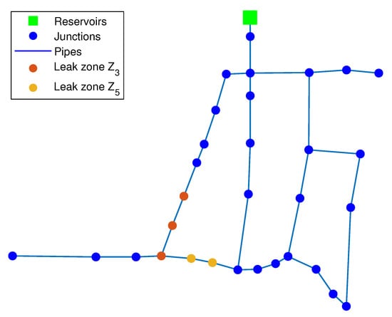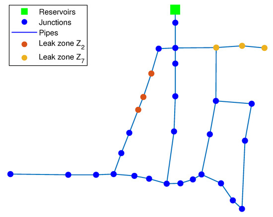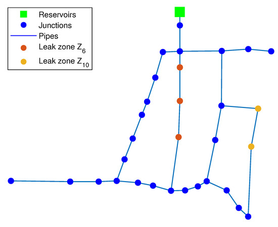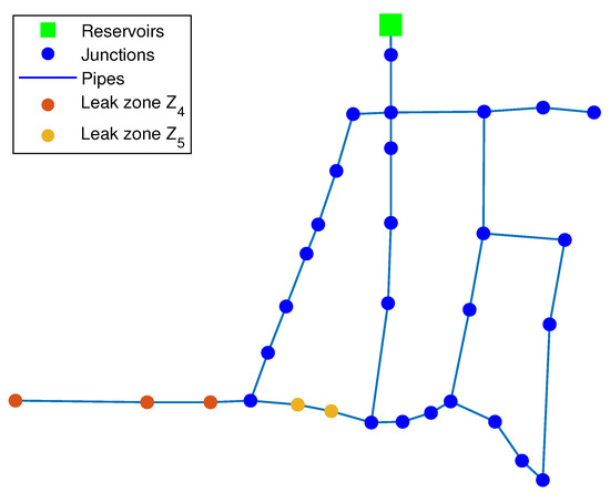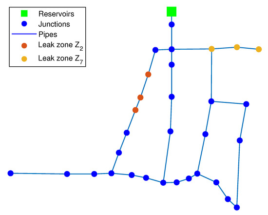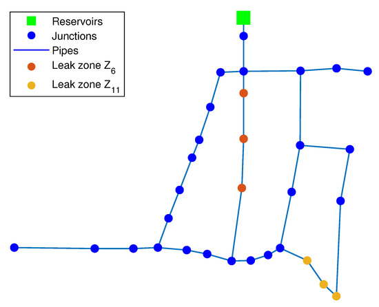This case presented is part of the 200 test cases in which the pressure measurements are corrupted by some noise and also that the leakage rate does not exactly match the values contained in the vector (17). In other words, there are uncertainties, such as pressure head measurements or leak flow rates. In this case, both the k-NN and the DA algorithms estimate exactly the zones in which the pair of leaks are occurring; in other words, and have been correctly identified. It should be noted that this identification does not provide the exact leaky nodes. However, the uncertainty is considered, in the worst case, two consecutive nodes far at most. Figure 8 and Figure 9 show the identified zones provided by both algorithms, respectively.