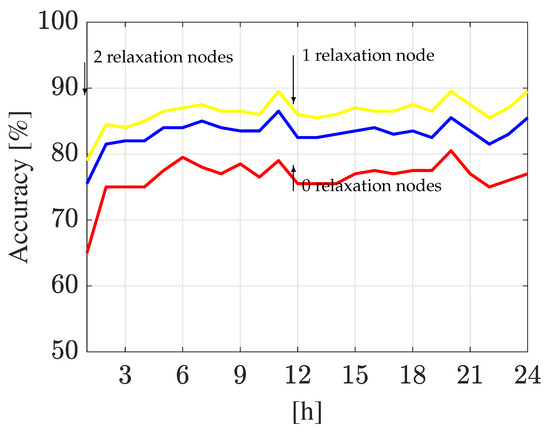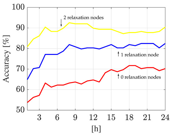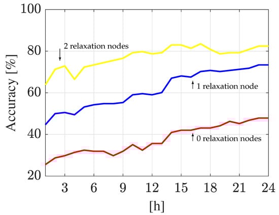 On the other hand, from Figure 23, it can be observed that the DA-based classifier had an accuracy rate of at the beginning and it reaches up to at the end of the analysis when the one relaxation node criterion is considered. Moreover, when the two relaxation node criterion is used, the accuracy rate reaches up to , respectively. Furthermore, when no relaxation nodes are used, the accuracy rate reaches a value of at 6 h, which is relatively maintained until 20 h when it declines in the last four hours of the analysis, decreasing up to at 24 h.
